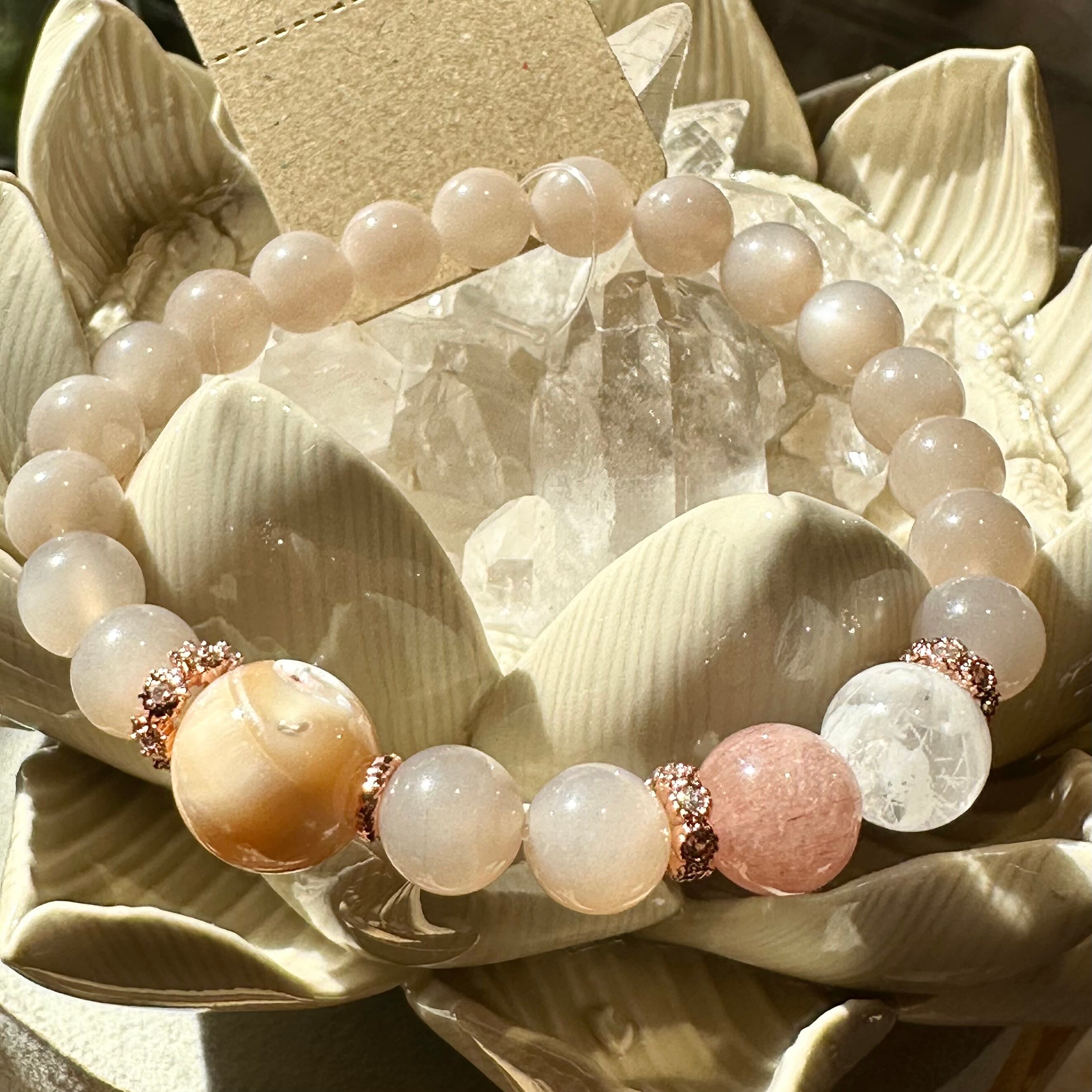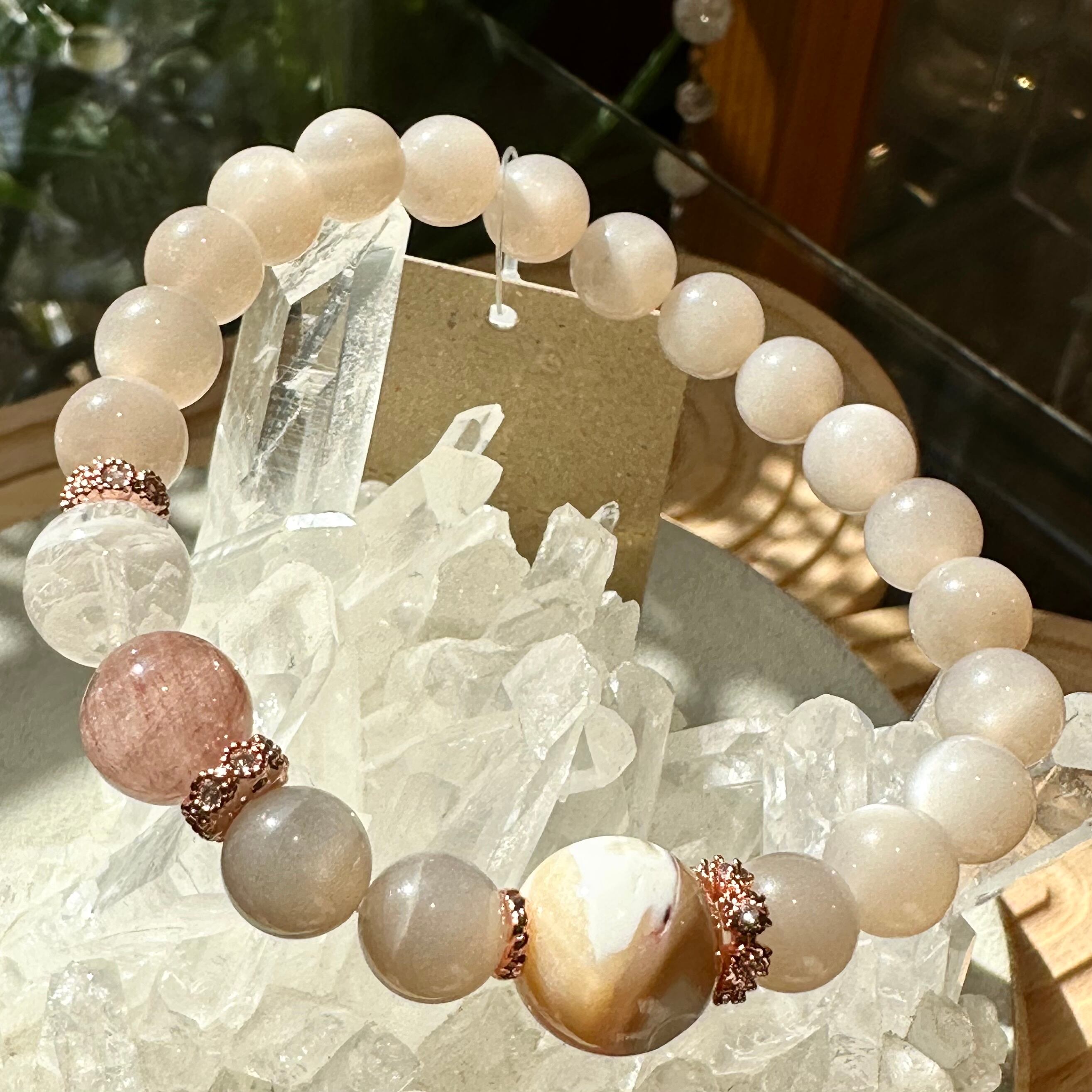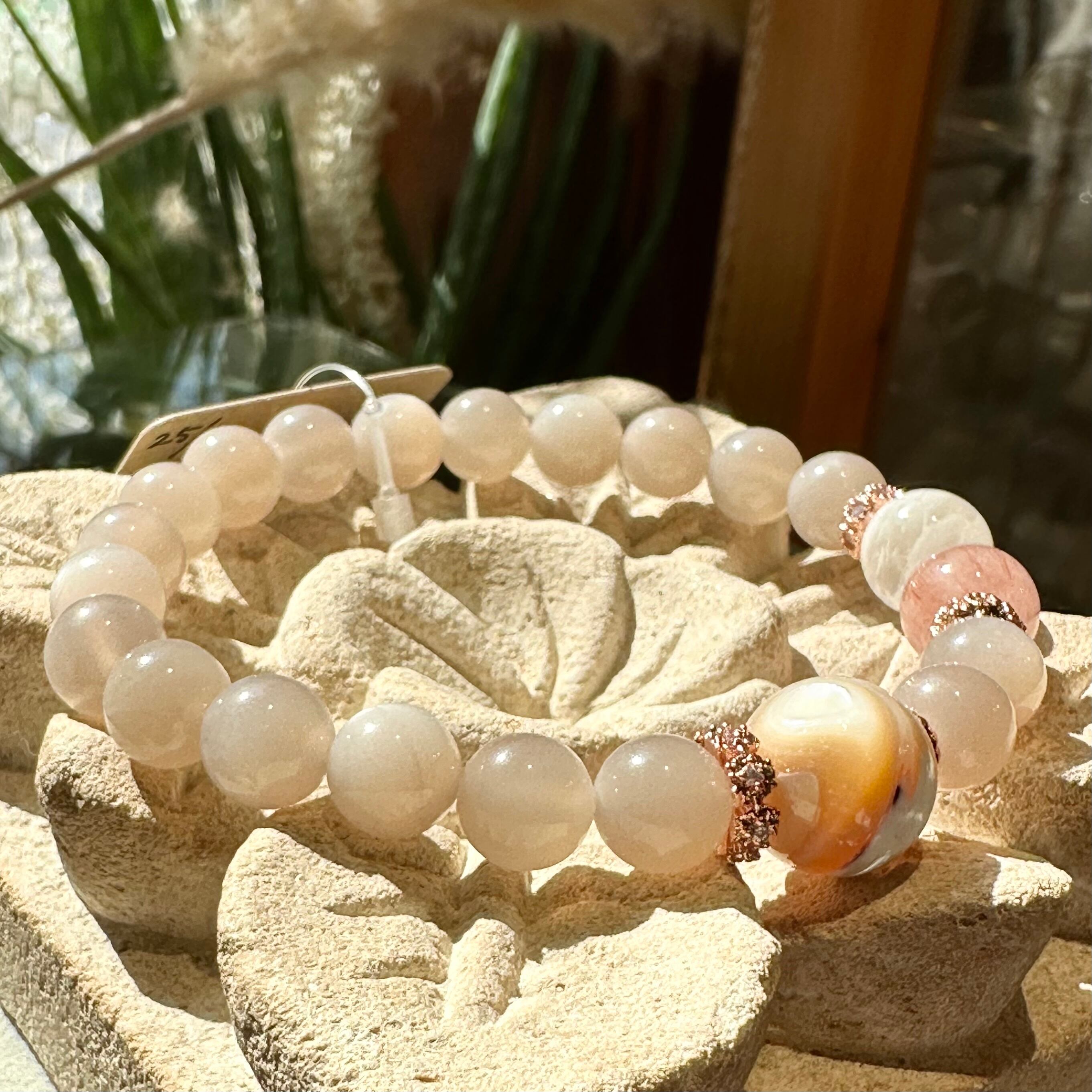 大人カラーのムーンストーンにシェル、サゲニティッククォーツ、