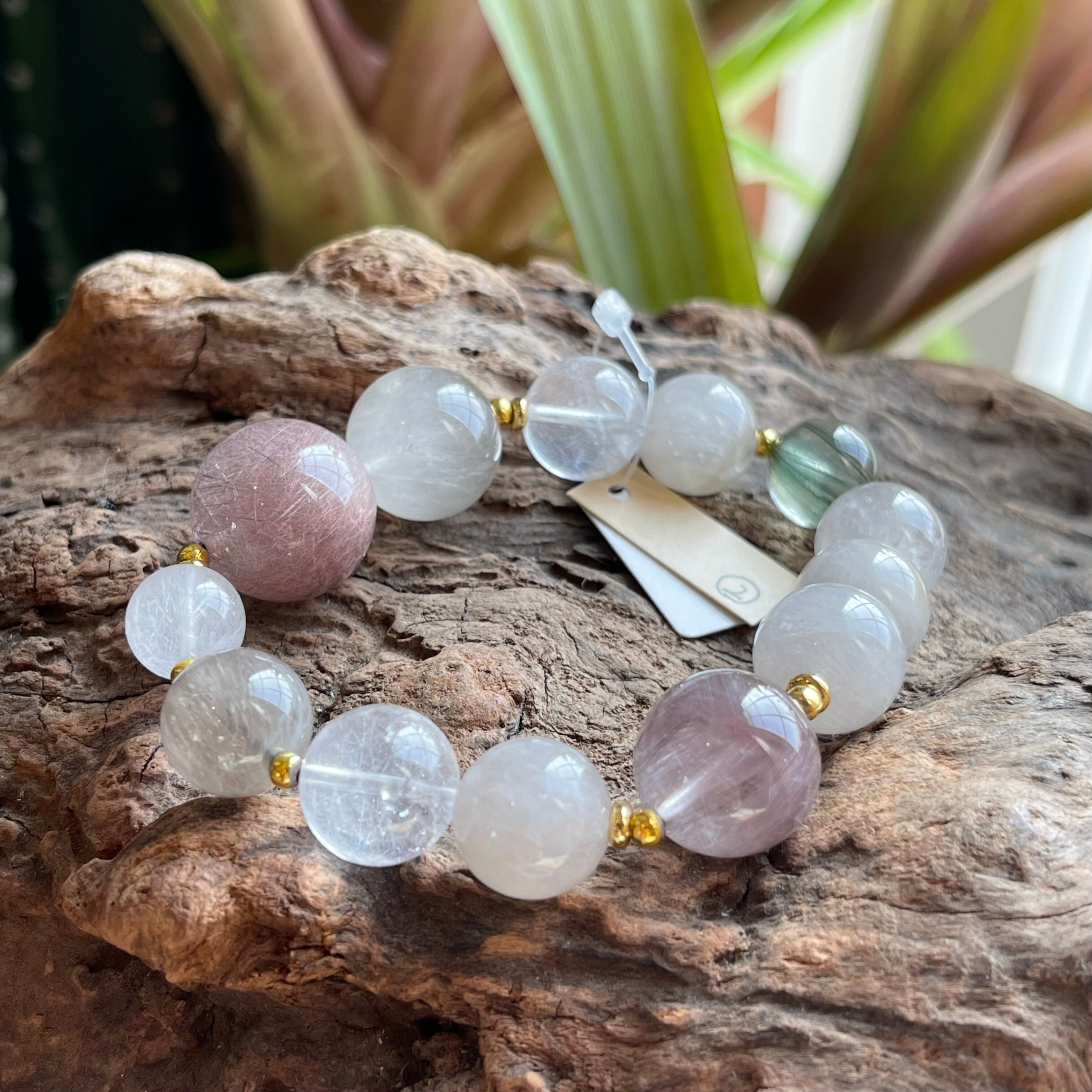 ピンクサゲニティック&パープルアクチノライトインクォーツ&グリーンアンフィボールインクォーツ&ホワイトサゲニティッククォーツデザインブレスレット01