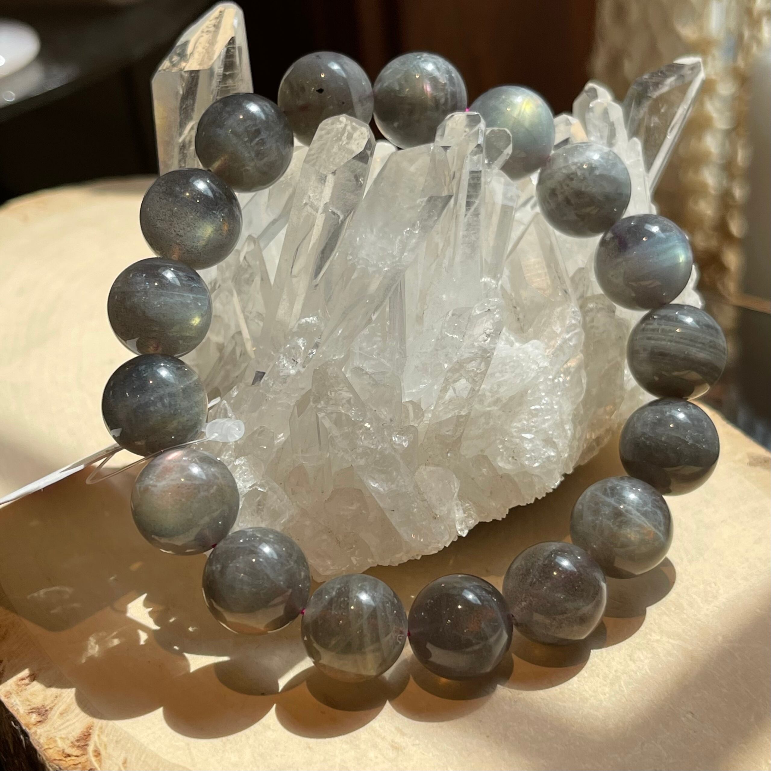 ピンクやパープルのラブラドレッセンスも見えるブレスレットです。