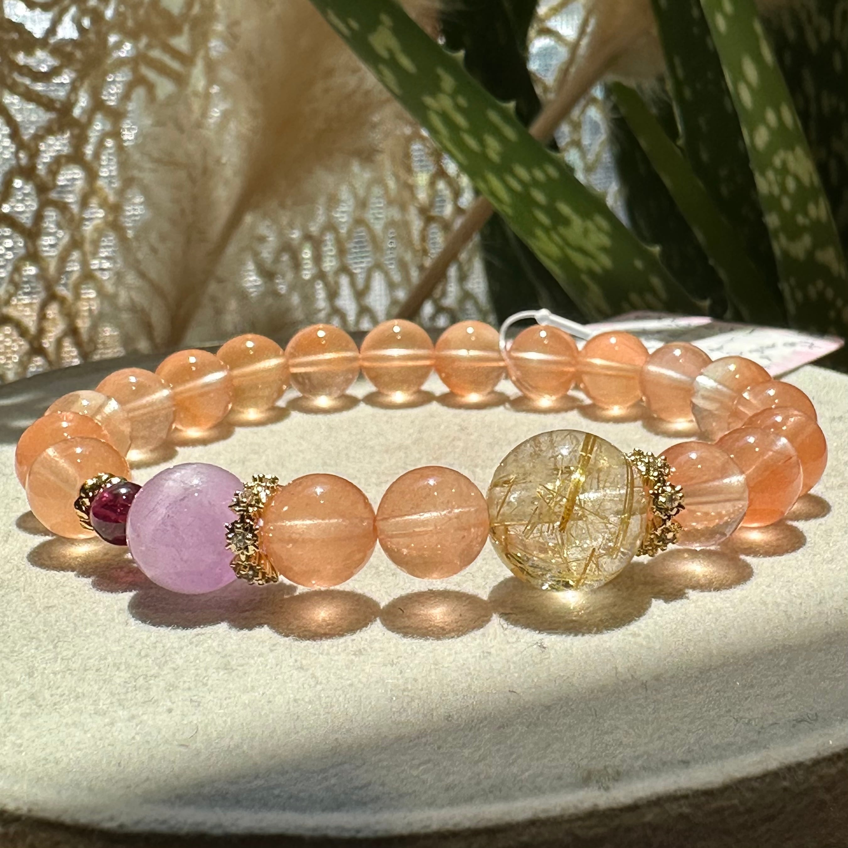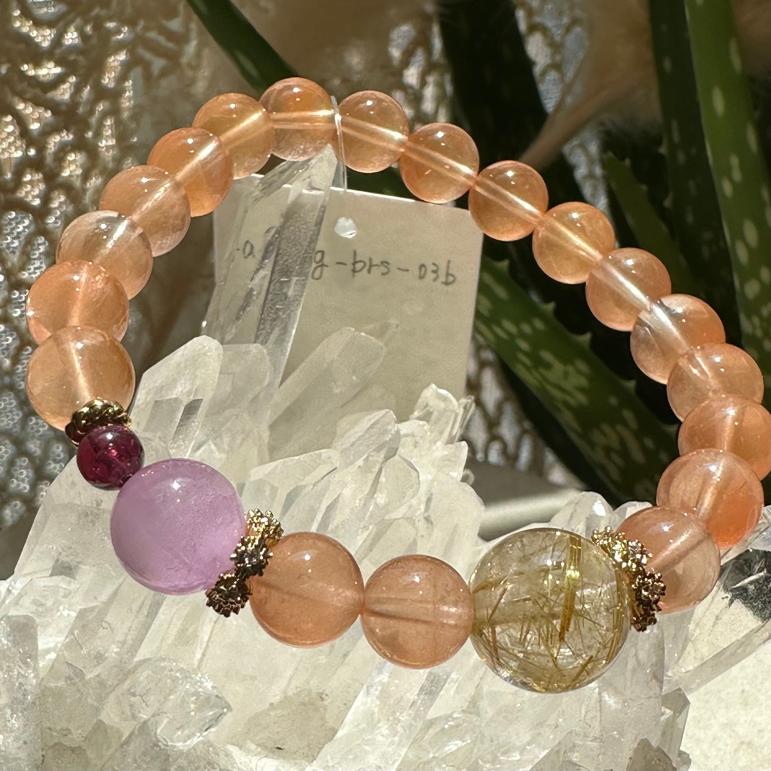 オレンジアンフィボールをベースに、ゴールドルチルクォーツ、クンツァイト、ロードガーネットを組み合わせて、元気をくれるような石たちでおつくりしたブレスレットです。